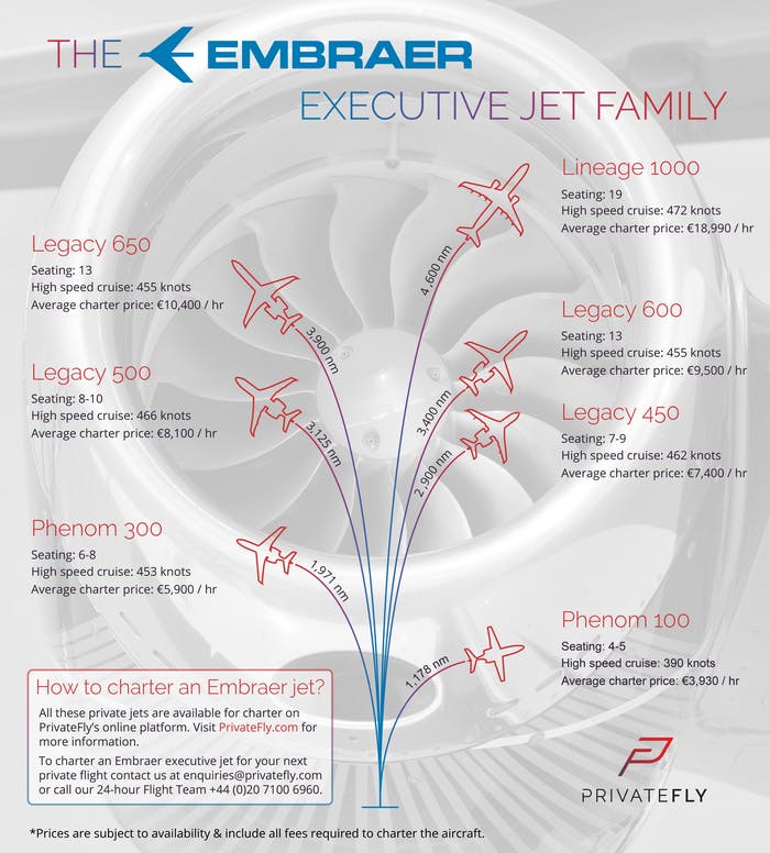 To charter an Embraer private jet, or to find out which aircraft is best for your flight, contact us or call the PrivateFly team 24/7 on +44 (0)20 7315 4427.