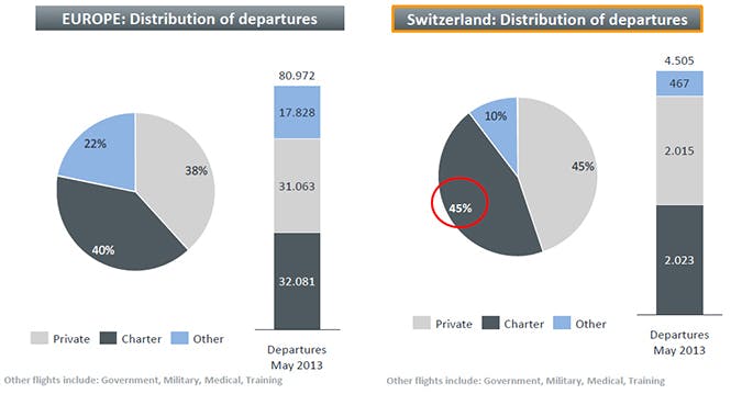 When you compare charter versus private flights (fractional or private-owned), the country has a higher proportion of charter flights than average, with 45% of its May 2013 departures being on chartered aircraft (versus 40% across Europe).