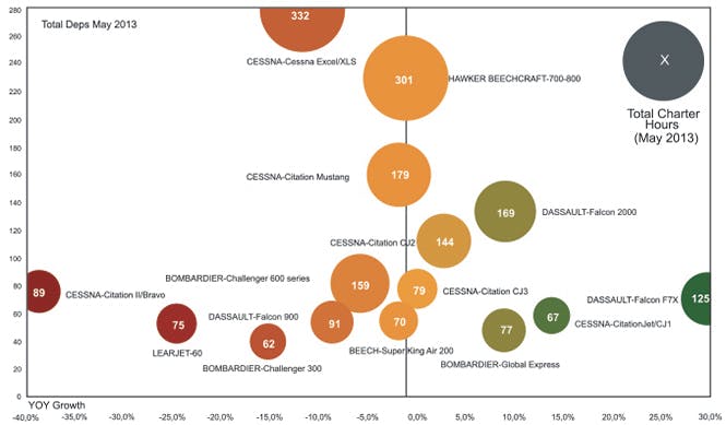 Charter is proving more resilient to market decline than private flights. May 2013, for example, saw just a 2.3% reduction in volumes for the charter segment against May the previous year, whereas a much bigger drop of 8.5% was seen for private or fractional flights.
