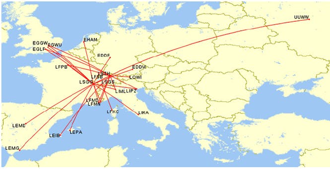 Seeing 40 aircraft movements per day, the route between Geneva to Zurich is a regular empty sector routing with private jets positioning across Switzerland for their next flight. The route is also popular for internal business trips, ski season flights, and international flight transfers.