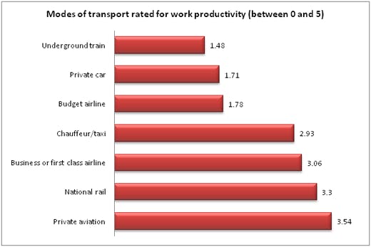 Private aviation is seen as the most productive form of travel, scoring 3.54 for work productivity and 4.32 for comfort and style.