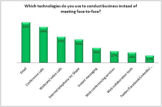 Web collaboration tools are used by 24% of executives while 27% use web conferencing services. Not surprisingly 98% of business leaders use email to conduct business and 86% use conference calls.