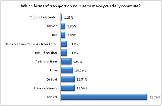 For the daily commute, the car is favoured by most business leaders (70%). This may be a reflection on the lack of investment in public transport. However, the survey was completed by a considerable number of business executives in London, which has the most advanced public transport infrastructure in the UK, so the continuing desire to use the car may be due to convenience, comfort and habit - suggesting that public transport still has much to achieve to win over this audience.