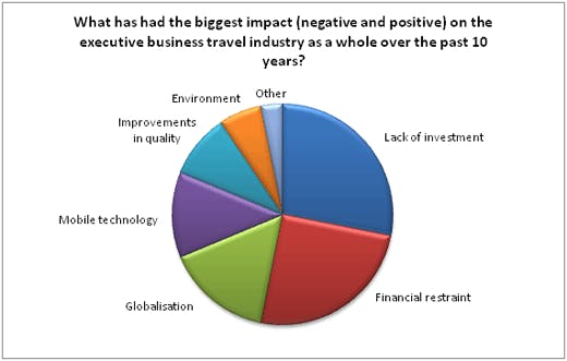 The majority of those surveyed, 64%, believe it has had a bigger impact on business travel than anything else in the past decade. It is possible that this figure will rise further in future, as the government announced in October 2010 that capital spending on transport would fall over the next four years by 11% from the annual £13.6bn budget. However, 21% believe the biggest impact has come from an improvement in the quality of transport and more links/connections.