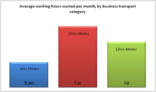 Business leaders are wasting almost one working week per month using ineffective and unproductive travel methods. On average, executives are unable to work for 34 hours and four minutes each month; some six hours and 27 minutes are wasted on train travel, 11 hours and 48 minutes on air travel and some 15 hours and 45 minutes on travelling by car.