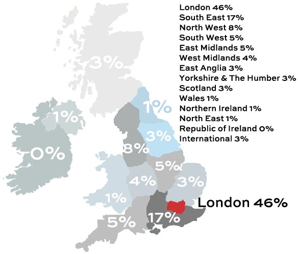 Almost half (46%) of PAs taking part work in London, with a further 17% working in the South East of England. The next most popular location was the North West (8%). The rest were spread across the UK, with 5% of participants describing their roles as international.